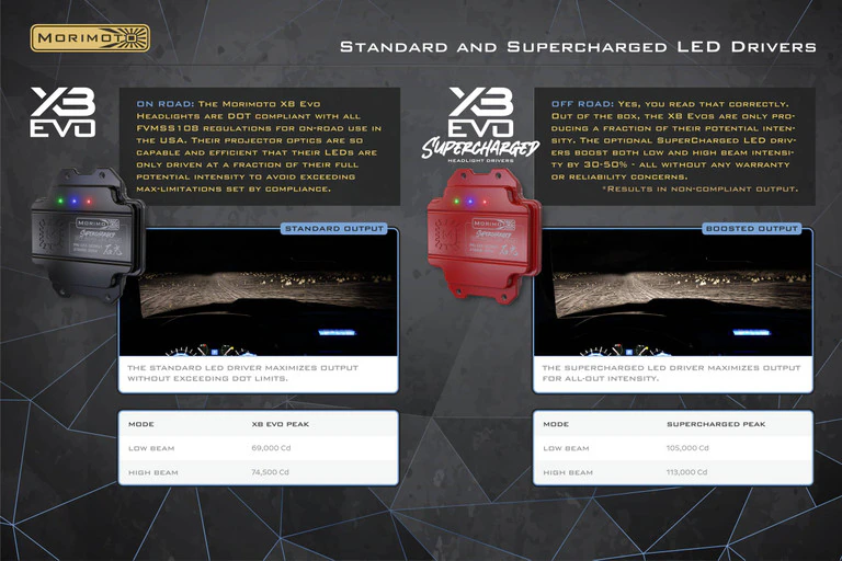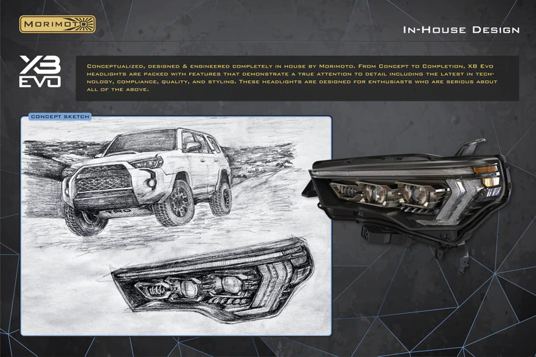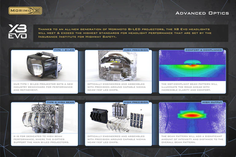 - XB Evo: Diese Scheinwerfer sind viel mehr als nur eine Designauffrischung. Sie zeigen Morimotos Engagement für Technologie, Konformität, Qualität, Design und Leistung für ernsthafte Enthusiasten.