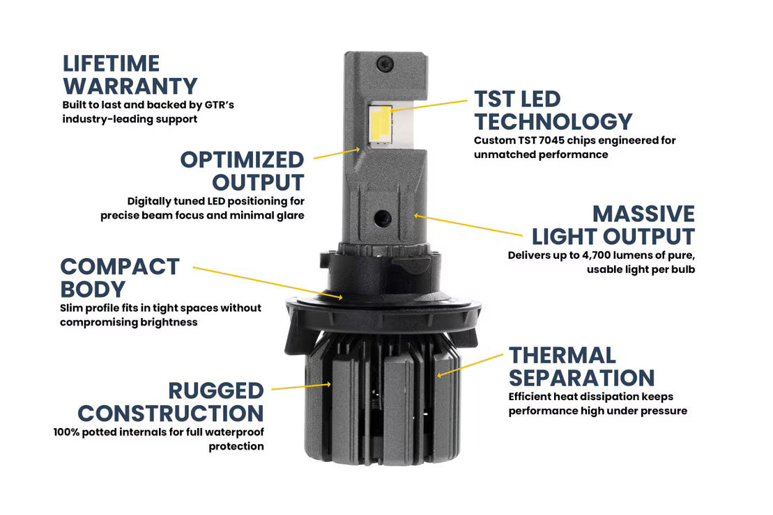 Mejor que nunca: después de casi una década de experiencia desarrollando y refinando nuestros diseños, obteniendo las materias primas de mejor calidad y recopilando comentarios de los usuarios finales sobre qué hace que la mejor bombilla LED con el patrón de haz más efectivo; estamos orgullosos de la nueva Ultra 2. Esta es una actualización de la bombilla LED que es más brillante. Que tiene un mejor patrón de haz. Dura más. Tiene más capacidad de ajuste. Y es más fácil de instalar. Establece un estándar completamente nuevo para lo que deberían ser las bombillas de su clase, y estamos orgullosos de llamarlo nuestro. Más brillante: ¡Las bombillas Ultra Series 2 de GTR Lighting utilizan la mejor tecnología de chip LED multinúcleo de grado automotriz para brindar una luz ultra brillante, en un patrón de haz ultra enfocado! Los chips NLW753 de grado automotriz de elec-tec no solo tienen más densidad de lúmenes que las opciones populares (pero ahora obsoletas) de CREE y Philips, sino que hay más. Hemos optimizado la posición de los LED para que, una vez fijados en la luz antiniebla, estén directamente en línea con lo que fue diseñada la óptica del proyector o reflector, lo que le proporcionará a usted, el conductor, el patrón de haz más útil y seguro. Los collares tienen una capacidad de ajuste rotacional total. En pocas palabras: verá mucho más, pero sin producir un deslumbramiento adicional para el tráfico que viene en sentido contrario. Más confiable: dejando de lado el rendimiento, ¡estas son las últimas bombillas LED para luces antiniebla que necesitará! Después de muchas simulaciones, llegamos a un diseño de disipador de calor que no solo es extremadamente eficaz para mantener el cuerpo de la bombilla a >80 °C, sino que también se ve bien. Dado que mantener bajas temperaturas de funcionamiento es clave para la vida útil del LED, lo hemos combinado con un ventilador sin cojinetes para enfriar activamente el disipador de calor también. La carcasa de nuestros controladores LED también está completamente encapsulada en el interior, lo que solo es posible con carcasas de fundición a presión costosas de producir como la que usa el Ultra 2. Mantener la temperatura fresca y todos los componentes secos es crucial, y el Ultra 2 cumple todos los requisitos. Mejor ajuste: Te desafiamos a encontrar una alternativa que produzca la misma cantidad de salida con el mismo tamaño pequeño que tiene la Ultra 2. Aquí adoptamos un enfoque equilibrado entre maximizar la salida y minimizar la geometría para que se adapten a cada aplicación. ¿Demasiada potencia y un disipador de calor inadecuado? Falla prematura. ¿Demasiada potencia y un disipador de calor enorme? Genial, pero no encajan en ninguna parte. Debido a su enfoque óptico superior, pueden crear hasta 10 veces más luz utilizable que otras opciones de bombillas LED a pesar de que solo producen 3900 lúmenes de luz. Si estás buscando la opción más brillante que sea una opción segura, la has encontrado. La mejor garantía: Puedes salir a la carretera sabiendo que estarás respaldado por una garantía de por vida a partir de ahora. Si en el raro caso de que algo salga mal, GTR Lighting reemplazará el producto rápidamente.