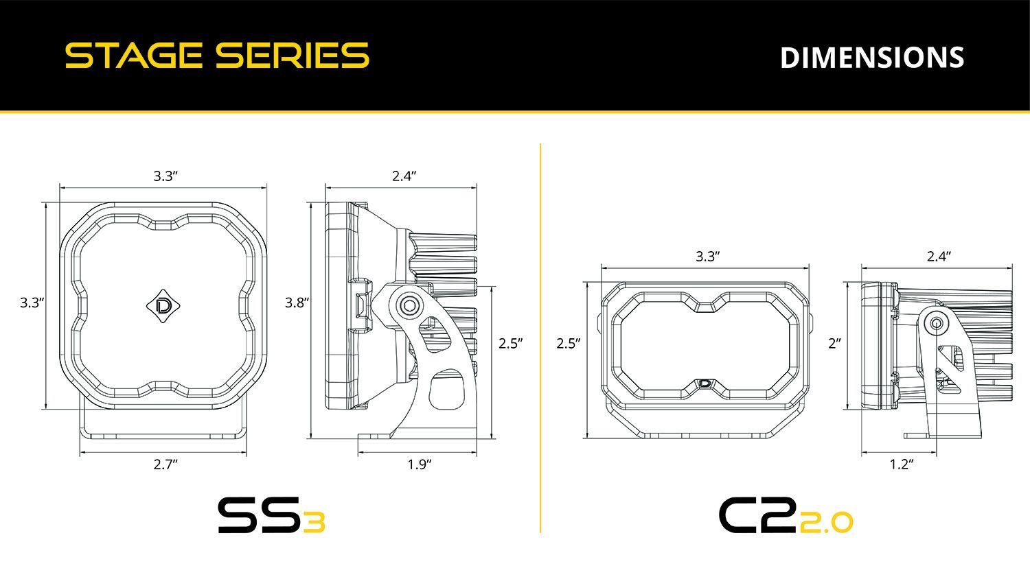 Blanco o amarillo. Todas las cápsulas LED de la serie Stage están disponibles en color blanco frío o amarillo selectivo. El blanco tiene una temperatura de color de 6000 K, que es una salida de blanco frío real y coincide con la mayoría de las luces LED de fábrica. El amarillo selectivo tiene una temperatura de color de 3000 K, ideal para un alto contraste en condiciones climáticas adversas o para una apariencia distintiva en la carretera. También ofrecemos lentes de repuesto que le permiten cambiar el color o la óptica de sus cápsulas SS3 o SSC2.