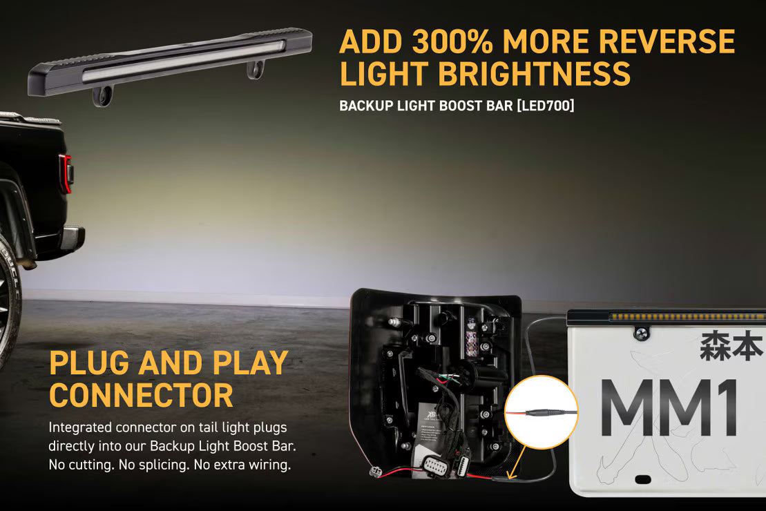 - Back up Boost: Optional Back up Boost light bar will plug n play and boosts output in reverse by over 300%