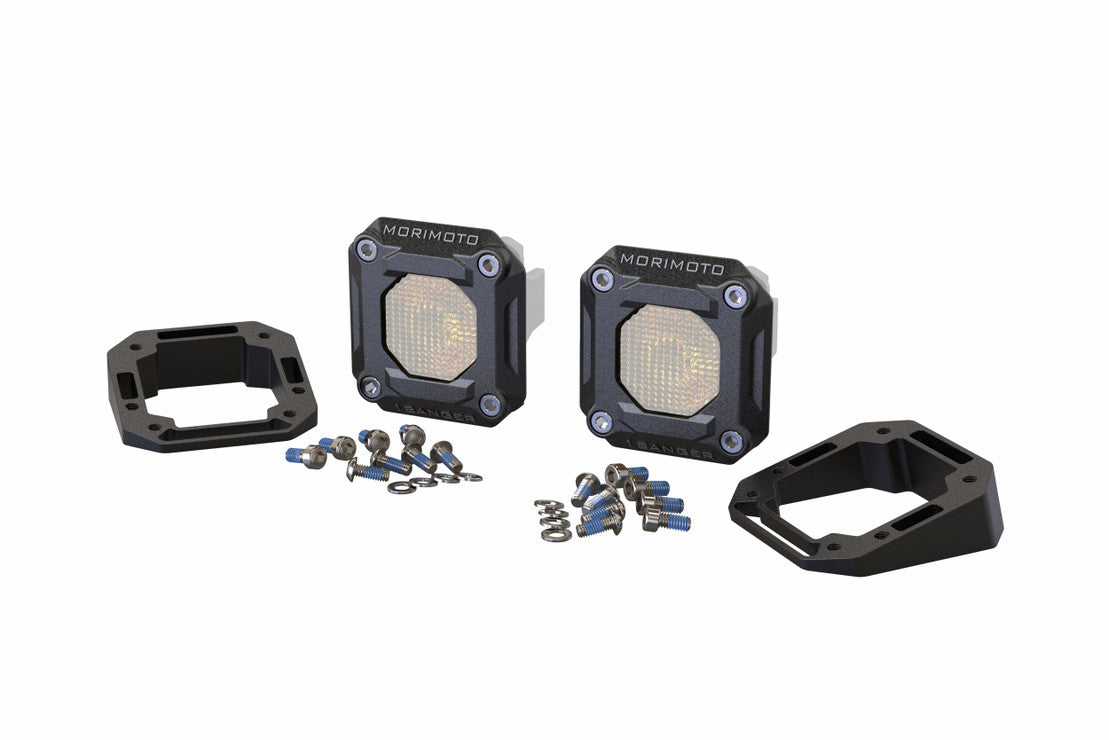 The Morimoto 1Banger Flush Mount System offers a sleek solution for seamlessly integrating compact LED Pods into various surfaces. With its versatile design, users can opt for a flush or angled installation, catering to different mounting preferences. Featuring proprietary technology, including optimized optics and thermal dynamics, these LED pods deliver high-performance illumination across four beam patterns: Wide/Fog, Spot, Combo, and Flood. Designed, engineered, and tested in Atlanta, Georgia, these products meet rigorous standards and come backed by a lifetime warranty. The kit includes stainless steel hardware and powder-coated brackets, ensuring durability and ease of installation for a range of applications, from steel bumpers to roof racks.