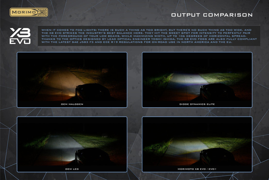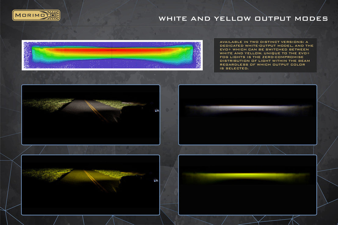 The all-new XB Evo and Evo+ LED fog lights are the latest iteration of a hugely successful product line launched over a decade ago that has been upgraded in every way. XB Evo and XB Evo+ fog lights offer the industry's best combination of beam width and intensity and are fully compliant with the latest SAE J583 F3 and ECE R19 regulations for on-road use in North America and EU. The Morimoto fog lights are expertly crafted to match all OE specifications to ensure perfect fitment and hassle-free install. They're designed as a direct replacement for the factory fog lights. The wiring is plug and play with the factory wire harness. Their integrated aiming adjusters allow you to dial in the beam height as well. This recipe delivers more of everything one would ask for in a good fog light and is available in two distinct versions: a dedicated, white-output model, and the XB Evo+ which can be switched on-the-fly between white and yellow. Morimoto fog lights aren't the most affordable, but they are built to a high standard and should easily last the life of your vehicle! We're proud to stand behind the product with an industry-leading ten-year warranty.